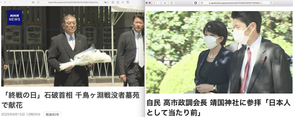 「Victory over Japan Day」 「対日戦勝記念日」 「終戦の日」:どちらが正しい? 石破首相 千鳥ヶ淵戦没者墓苑で献花 対 高市早苗 元内閣府特命担当大臣 (クールジャパン戦略) 靖国神社に参拝「日本人として当たり前」 Yasukuni Shrine 靖国神社 vs. 対 千鳥ヶ淵戦没者墓苑 Chidorigafuchi National Cemetery