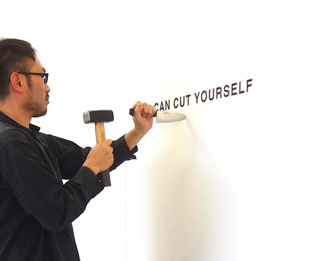 Another person of extremely important relevance is Serbian conceptual artist and performer Marina Abramović. The risk-taking actions by her may have influenced Hashimoto, giving him a Christian-related ‘Absolution’, so to speak. To do whatever he likes to do, art for art’s SAKE. On the other side, Hashimoto’s interactive performative character injects a welcome communication-tool with other exhibition visitors, too, bringing much pleasure and enjoyment.